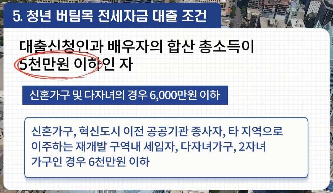 단, 예외적으로 신혼가구,현신도시 이전 공공기관 종사자, 타 지역으로 이주하는 재개발 구역내 세입자, 다자녀가구, 2자녀 가구인 경우 6천만원 이하까지 가능합니다.