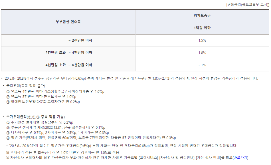 - 기본금리는 소득에 따라 1.5%~2.1% 이며 우대금리도 적용되오니 아래내용을 참고하시기 바랍니다.
